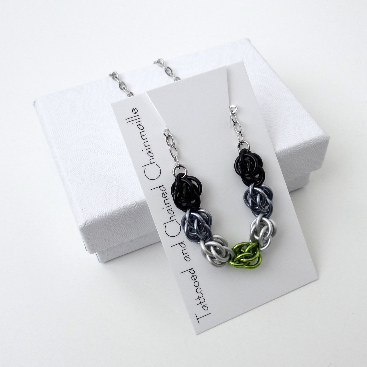 Your agender pride chainmail necklace will arrive carefully packed within a white jewelry box lined with cotton and tissue paper and enclosed in a plain white bubble mailer.