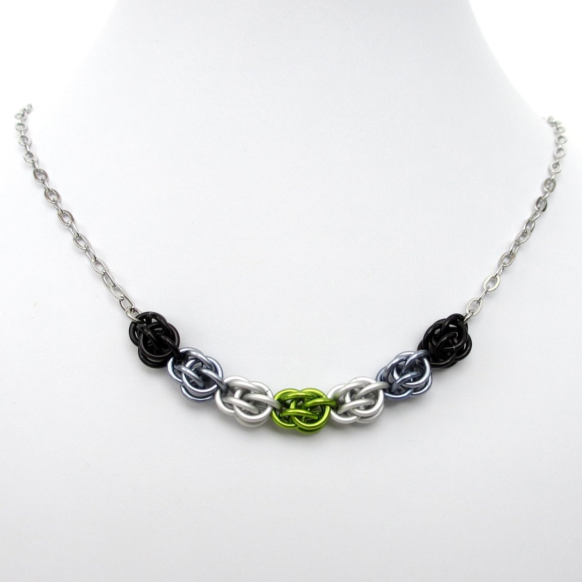 This agender pride chainmail necklace was handwoven in the Sweetpea weave. One unit of each color of the agender flag - black, gray, white (matte silver), lime green, white (matte silver), gray, and black - make approximately a 2.75 inch long focal point at the front of the piece. The rest of the necklace is 3mm stainless steel oval link chain. A stainless steel lobster claw clasp is the finishing touch.