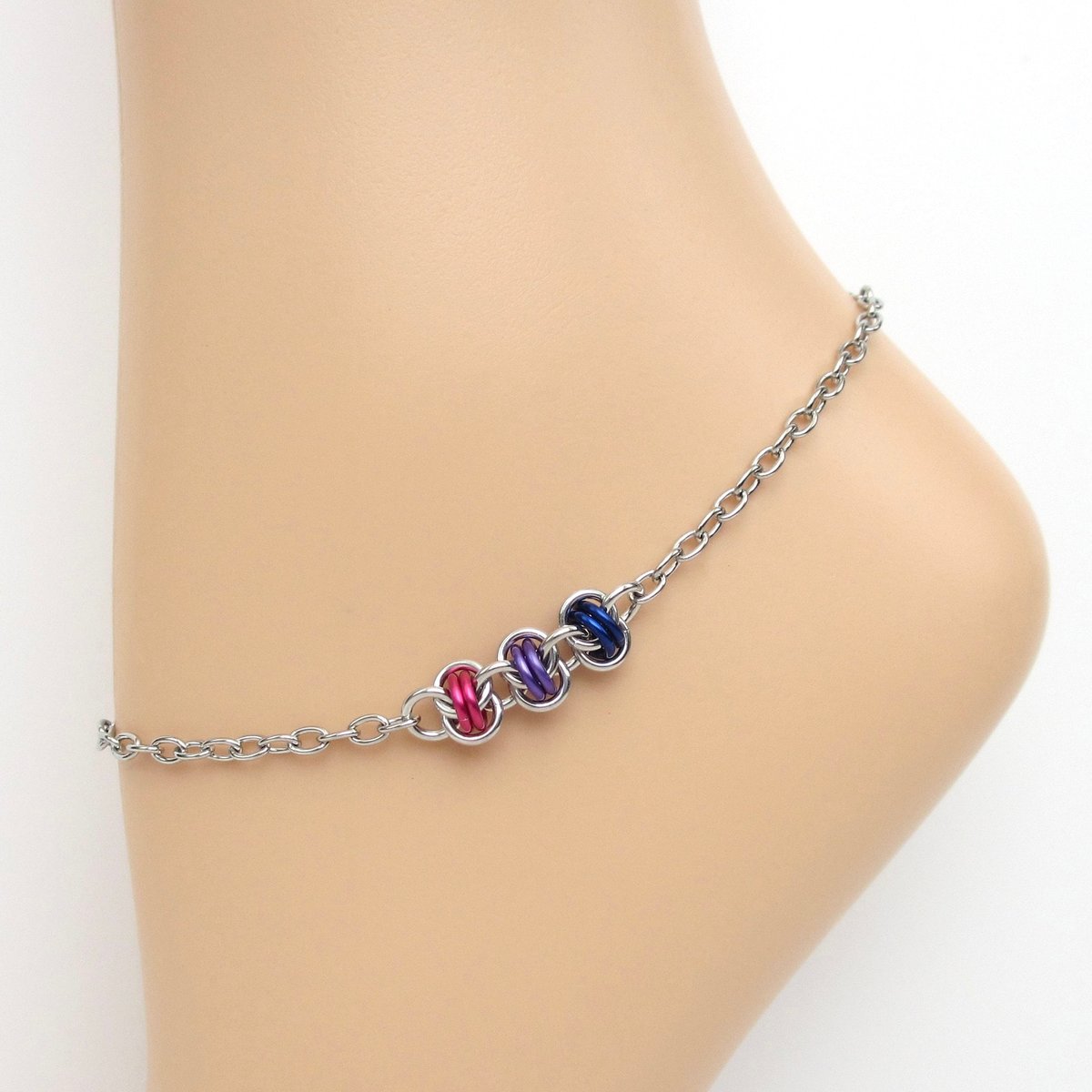 This adorable bi pride anklet features a short length of the chainmail barrel weave as the focal point. The barrel weave section measures a discreet 1 inch and was handwoven using anodized aluminum jump rings in the flag colors of pink, purple, and blue.