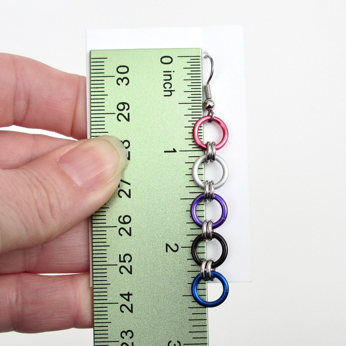 Show your pride with these simple and beautiful genderfluid pride flag earrings. One ring each of pink, white (matte silver), purple, black and blue anodized aluminum jump rings were woven together with small silver aluminum jump rings. The fish hook style ear wires are hypoallergenic stainless steel. Aluminum is a very lightweight metal that's perfect for earrings.